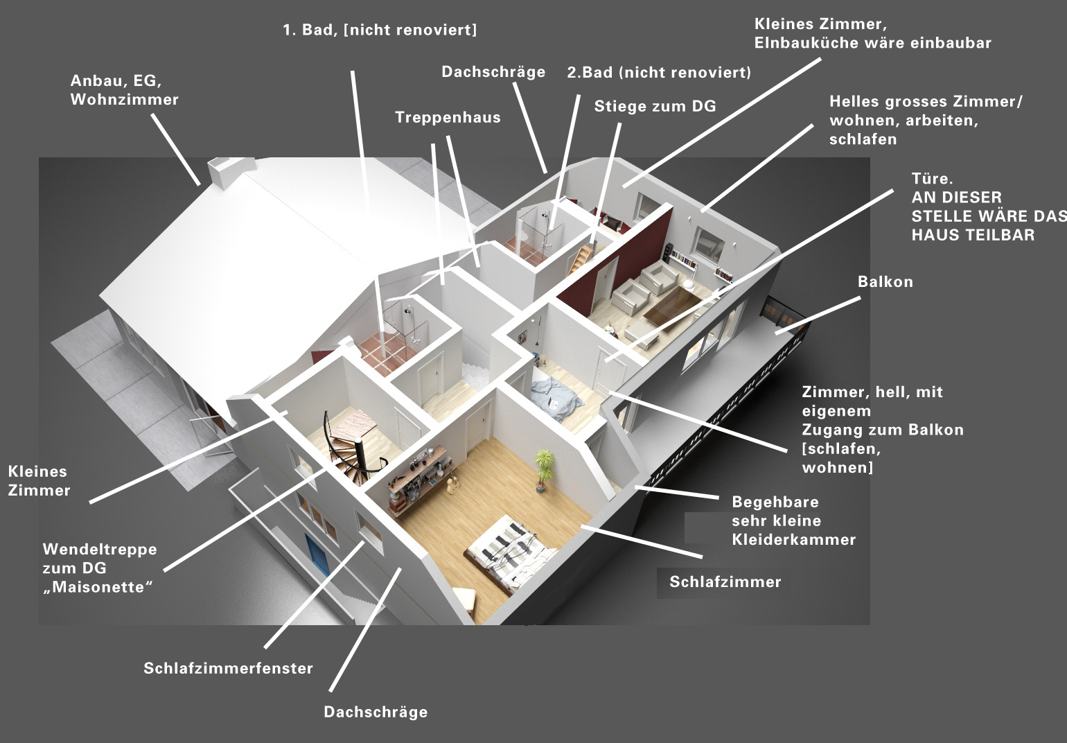 | DG Der linke Teil ist über eine Wendeltreppe mit dem kleinen darunter liegenden Zimmer als Maisonette verbunden. HINWEIS: Der linke Teil des DGs ist deutlich kleiner als hier im Modell. Der rechte, größere Teil des DG wurde in den 60ern [sehr einfach] ausgebaut und ist z.B. als ein Jugendzimmer geeignet oder bietet viel Platz für Übernachtungsgäste. Der rechte Teil hat 2 rückwärtig ausgerichtete kleine Dachgauben, der (abgetrennte) kleinere linke DG-Teil hat ein grosses Dachfenster über dem Bett. Die Treppe zu der rechten Seite des DG ist derzeit nur eine sehr einfache, schmale Holzleitertreppe. |