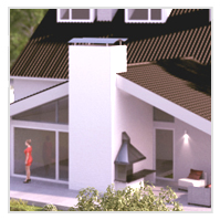 | An der linken Seite (linker Bildrand dieses 3-D Architektur-Modells) gibt es ebenfalls eine grosse Terrassendoppeltüre, die sich ganz öffnen lässt und den Zugang auf eine zwéite kleine sonnige Terrasse ermöglicht. |