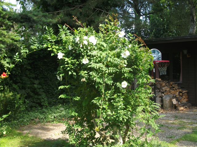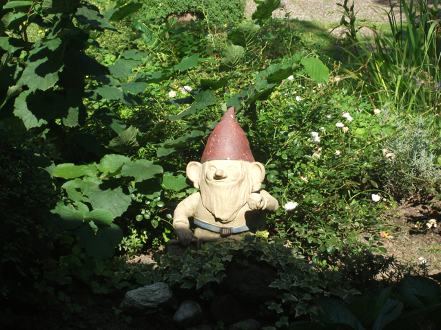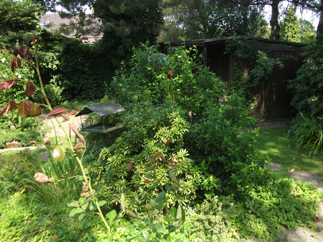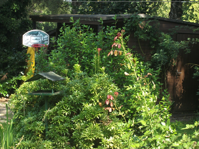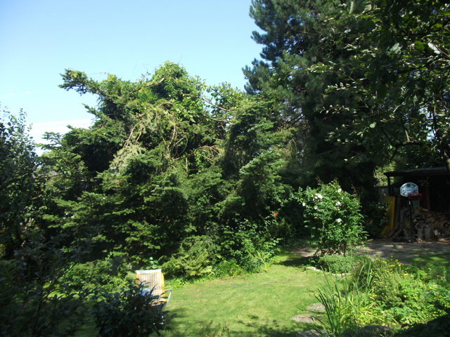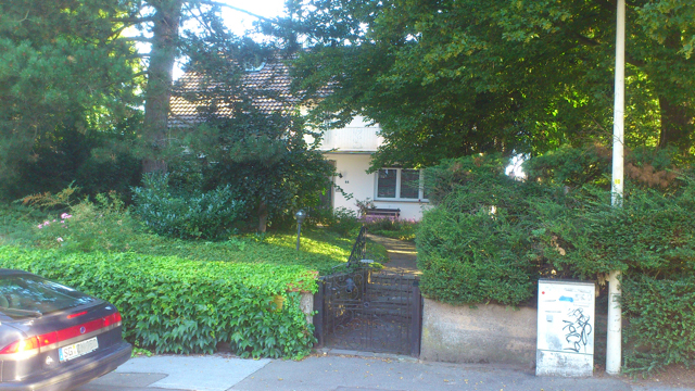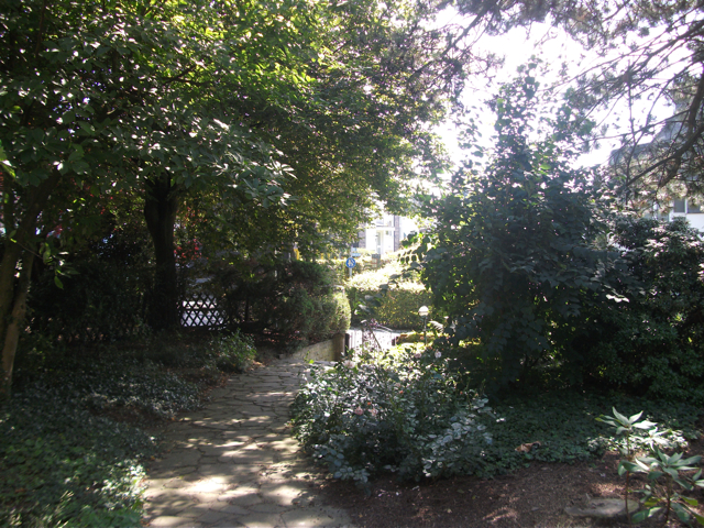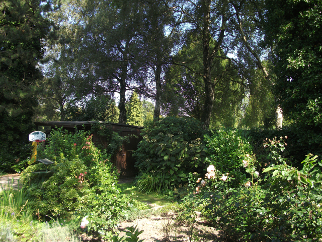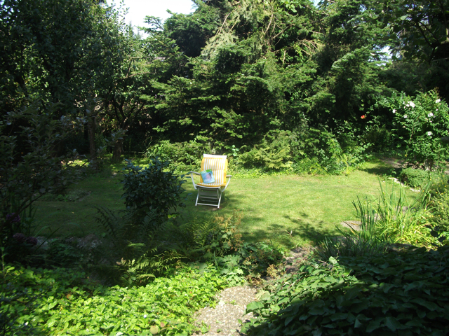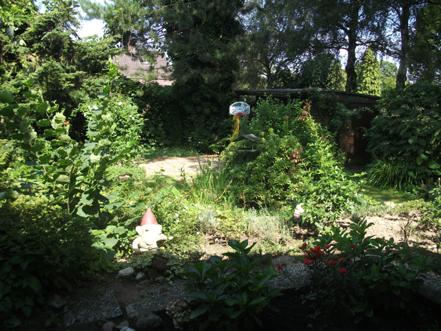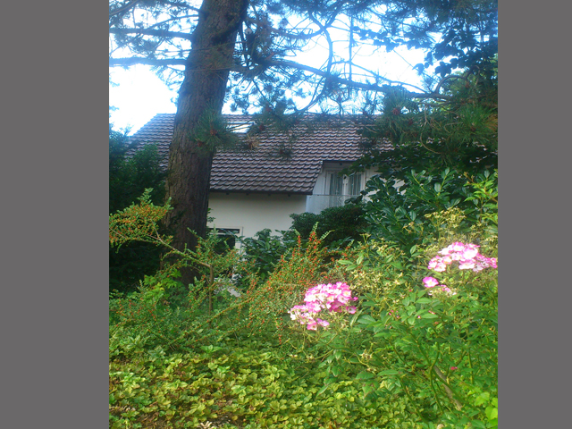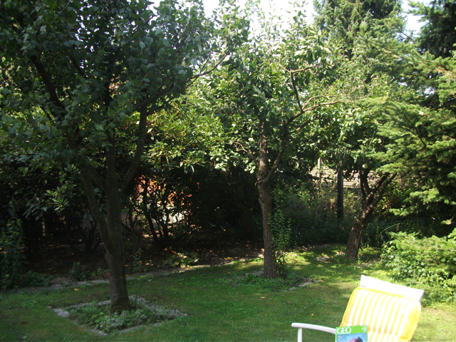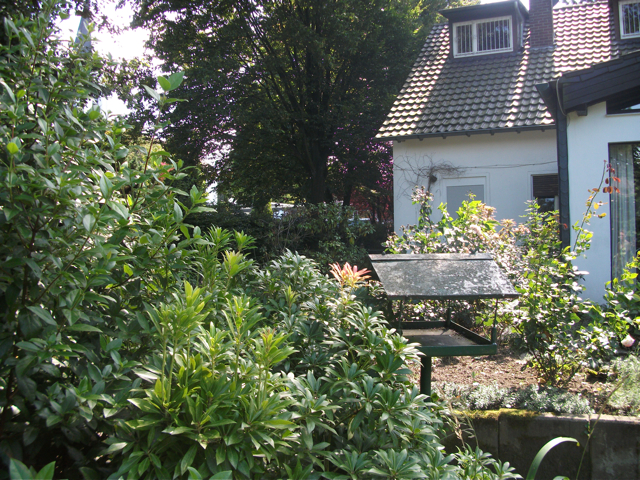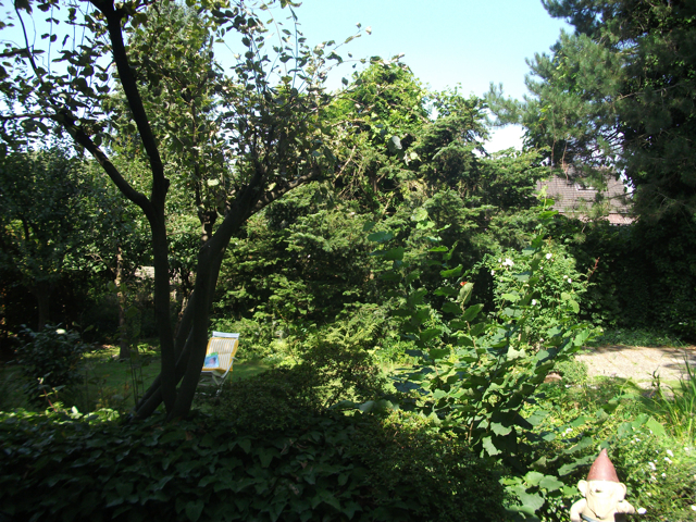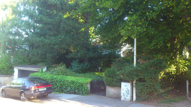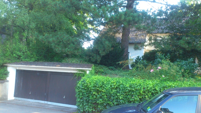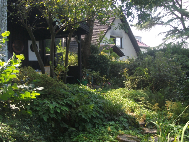 Der idyllische Garten verfügt [anders als im Eindruck auf den stark vereinfachten gerenderten 3-D Computer-Bildern] über eine sehr üppige, schöne Vegetation mit über Jahrzehnten gewachsenen schönen, sehr hohen Bäumen etc.. Im rückwärtigen Garten befindet sich ein ausreichend dimensioniertes Holzgartenhaus (siehe Fotos). Im vorderen Garten befinden sich neben Blumen- und Rosenbeeten ebenfalls viele schöne, blickschützende z.T. hohe Bäume und unter dem Rasen liegend zur Strasse eine Doppelgarage. Weitere Parkmöglichkeiten, z.B. für Besucher finden sich aber auch auf der (nicht zum Haus gehörenden) Fläche direkt vor dem Haus.