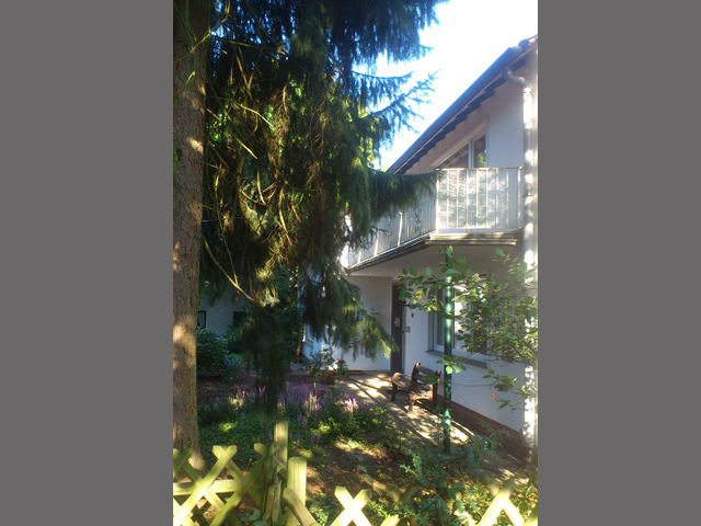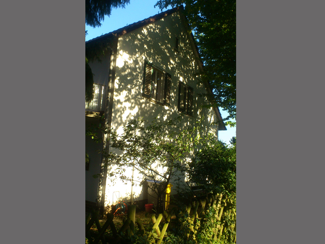 | Im 1. OG befinden sich in der rechten und der linken Hälfte jeweils ein Bad, (diese Bäder sind NICHT renoviert) sowie Schlaf und Wohnzimmer. Das kleine Zimmer links ist eine Maisonette-Wohnung mit einer Wendeltreppe ins Dachgeschoss. Vor dem Schlafzimmer in der Mitte des 1. OGs befindet sich ein grosser heller Balkon, der von 2 Zimmern zugängig ist. Das Zimmer rechts aussen eignet sich sowohl als Arbeitszimmer, Wohnzimmer oder als Schlafzimmer. Auch hier könnte die rechte Hälfte des Hauses [eigenes Treppenhaus] als eigenständige Wohnung sehr einfach abgetrennt werden. |